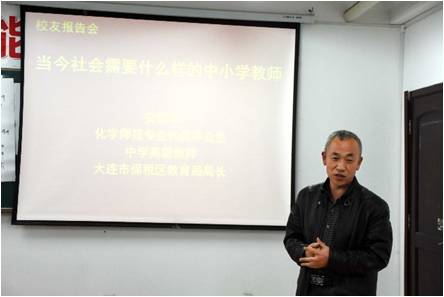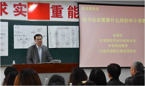 化学(师范)专业90届优秀毕业生、大连市保税区教育文化体育局局长安恒华应邀作“当今社会需要什么样的中小学教师”主题报告,党总支书记刘智广,颜射