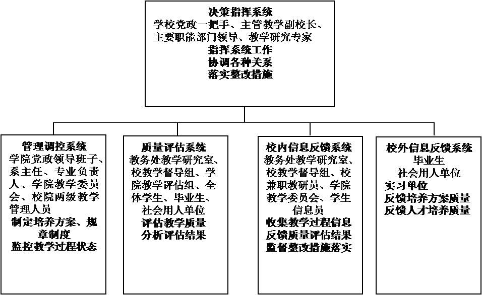在60余年的办学历史中,有严格教学管理传统。学院立足培养高素质复合型人才,确立了与本专业定位和人才培养目标相一致的质量标准,建立了一套由决策指挥系统、管理调控系统、质量评估系统、校内信息反馈系统和校外信息反馈系统组成的行之有效的教学管理机制,对培养方案制订、培养方案实施中的理论课教学、实验教学、集中实践、考试环节及毕业设计等各环节中的教师教学过程、学生学习过程、教学管理过程和毕业生质量等方面进行指挥决策、检查评价、信息反馈、整改调控。该管理机制组成及功能如下: