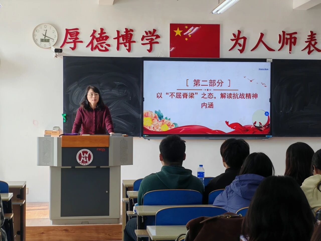 于伟老师以抗日战争的光辉历程为切入点,系统回顾了那段艰苦卓绝的岁月。她指出,抗战是一部千锤百炼的英雄史诗,中国人民在血与火的考验中铸就了视死如归的民族气节、血战到底的英雄气概和百折不挠的必胜信念,这段历史深刻启示我们,要始终将个人命运与国家前途紧密相连,以不屈的脊梁扛起时代重任。她强调,新时代青年要以史为鉴,做到“四维协同”:以维护和平筑牢发展根基,以民族振兴推动国家图强,以深化国际合作促进共同进步,以传承优秀文化赓续精神血脉。最后,她围绕“以青春担当续写抗战精神”发出号召,鼓励同学们坚定理想信念、厚植爱国情怀,勤奋学习增强本领,勇担时代责任,以实际行动践行初心使命。