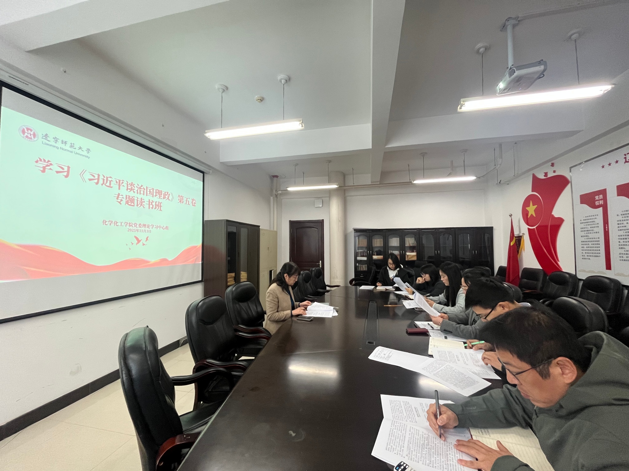 会上,于伟书记首先传达了校党委关于认真组织学习《习近平谈治国理政》第五卷的通知,并指出本次学习将聚焦《习近平谈治国理政》第五卷中“一体推进教育、科技、人才事业发展”这一重要专题。该专题系统阐述了新时代做好三项工作的战略意义和内在联系,为高校落实立德树人根本任务提供了方向指引。随后,在原著研读环节,中心组成员严格遵循“原原本本读原著”原则,逐篇领学了专题中“加强基础研究,实现高水平科技自立自强”“激发各类人才创新活力和潜力”等五个部分的内容,通过读原著、学原文、悟原理,在逐字逐句的研读中深刻领会核心要义,准确把握新时代教育科技人才工作的实践要求。在集中研讨环节,与会成员结合学院发展实际与分管工作深入交流学习心得。大家一致认为,《习近平谈治国理政》第五卷中蕴含的战略思想和理论精髓,为学院优化学科布局、推进体系化科研提供了根本遵循。