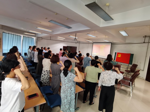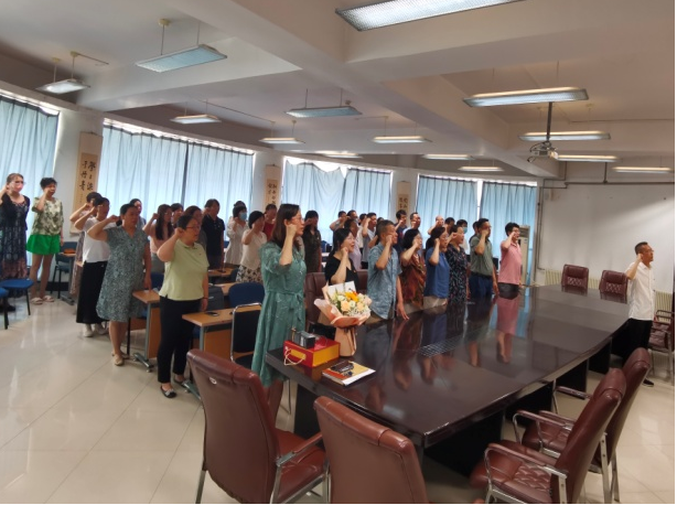 欢送仪式后,退休党员石雷老师与学院全体党员教师一起重温入党誓词。面对鲜红的党旗,全体党员佩戴党徽,举起右手、握紧拳头,在冯俊勇书记的带领下庄严宣誓,再一次接受心灵的净化和洗礼,更加深刻地领悟习近平新时代中国特色社会主义思想,把学习成果转化为指导实践的强大力量。老教师们为辽师的发展、学生的成才贡献了力量,为党的教育事业奉献了青春年华。我们要从退休教师手中接过接力棒,不断传承他们高尚的师德和优良的品质,保持共产党员的先进性,增强集体凝聚力,为推动学院中心工作的高质量发展贡献自己的力量。