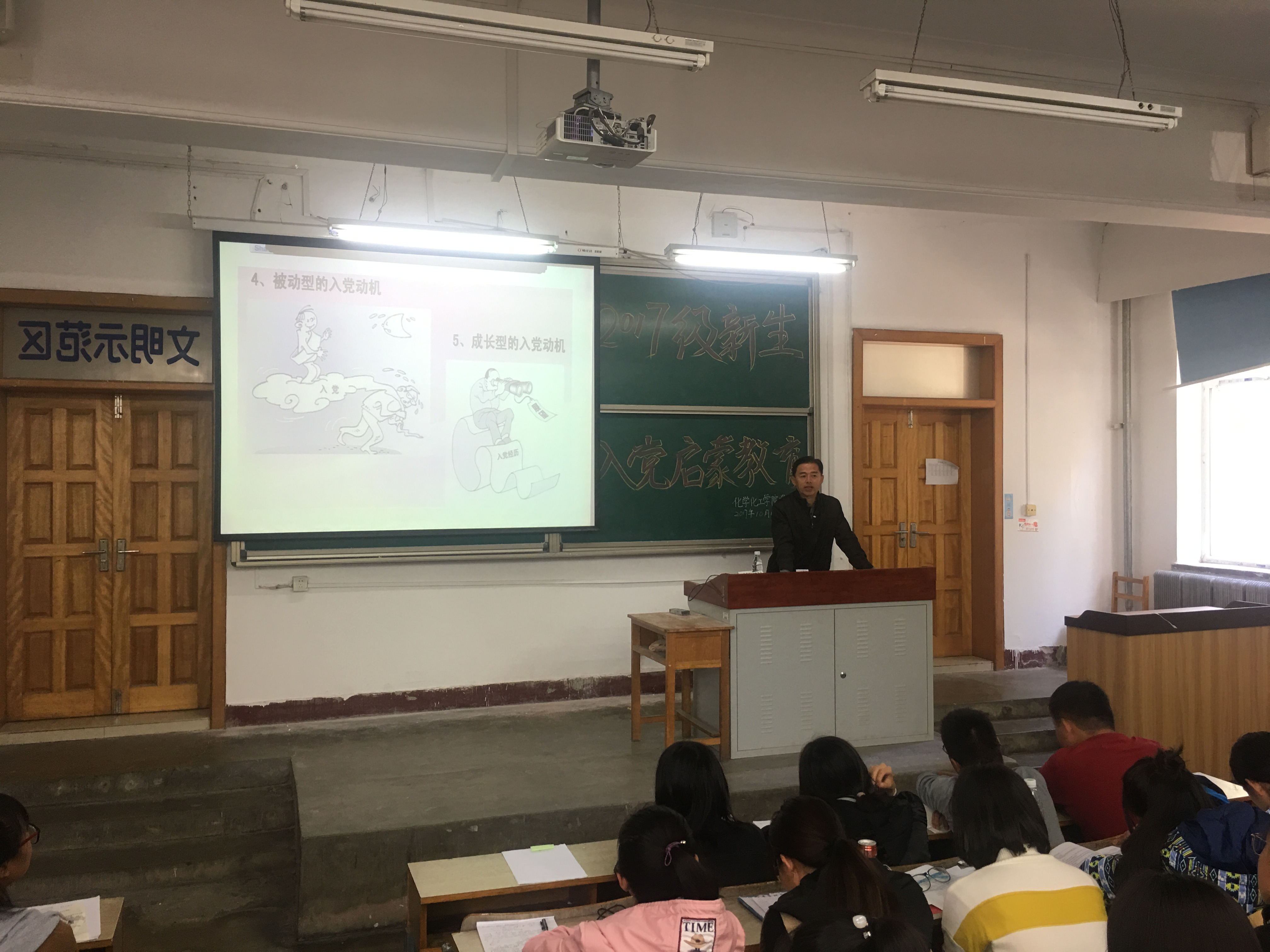 于管理楼102举办2017级学生入党启蒙教育第一讲,由学院党总支书记刘智广老师做题为“端正入党动机”的专题报告。