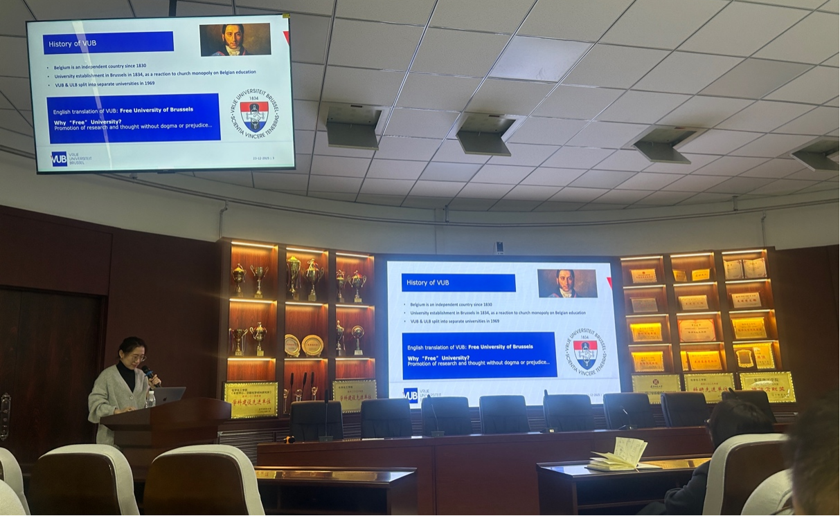 会议伊始,项目主要申报人之一的罗铭月老师,系统介绍了“高校化学专业创新型人才合作培养”项目的核心内容,涵盖派出机制、遴选流程及年度计划——该项目每年将资助5人赴比利时布鲁塞尔自由大学(VUB)及英国兰卡斯特大学研修。作为VUB校友,罗铭月老师还结合自身经历,详细分享了VUB化学系在有机化学、量子计算化学及环境化学等领域的国际领先研究团队、知名导师与前沿课题,并介绍了布鲁塞尔的学习生活环境、文化风土人情及实用生活贴士,为师生提供了切实可行的参考。