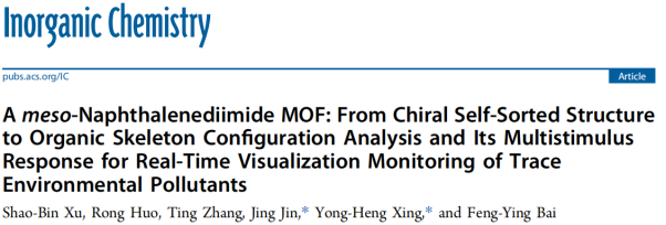 论文信息:A meso-Naphthalenediimide MOF: From Chiral Self-Sorted Structure to Organic Skeleton Configuration Analysis and Its Multistimulus Response for Real-Time Visualization Monitoring of Trace Environmental Pollutants.