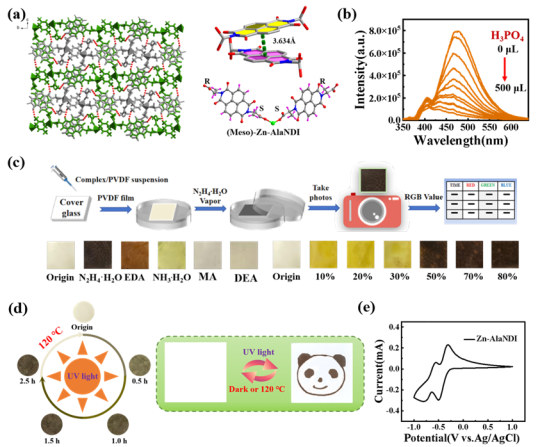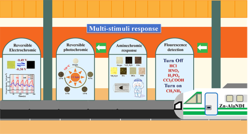 刺激响应材料,能够将光、电、热、pH等外部刺激转化为可量化的响应信号,在信息技术和生物探针等领域,尤其在可视化监测方面表现出显著优势。然而,传统材料(如有机染料和金属配合物)在多功能性和实际应用中仍面临局限性。得益于萘二酰亚胺(NDI)衍生物优异的电子亲和性、氧化还原活性和刚性共轭结构,NDI-MOFs已经成为构筑多重响应材料的理想平台。最近,邢永恒教授团队(金晶副教授,张婷副教授)成功构建了一种基于手性氨基酸功能化的NDI MOF(Zn-AlaNDI),并展示了其在多刺激响应材料中的应用潜力。Zn-AlaNDI对盐酸,硝酸,磷酸和三氟乙酸四种酸性化合物显示了不同程度的荧光淬灭效果,其中对磷酸的传感能力最佳,KSV和LOD值分别为4.05×10−4M−1和0.25 μM.而对于碱性化合物(氨水、甲胺、乙二胺、三乙胺、二乙胺),Zn-AlaNDI显示了荧光增强的传感效果,对甲胺检测限低至1.55 μM,因而用于选择性区分常见酸/碱分子。除此之外,Zn-AlaNDI对胺蒸气、光和电的刺激具有明显的视觉变色响应。EPR光谱表明颜色的变化与框架内NDI基团自由基的生成有关。Zn-AlaNDI的聚偏二氟乙烯(PVDF)薄膜对胺蒸气具有选择性和浓度依赖性变色响应,展现出良好的稳定性和可重复使用性,适用于无墨可擦写打印和信息加密等领域。